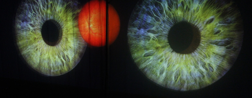 Photographs of the video work Eye/I 2021 projected onto a 6m voile screen.